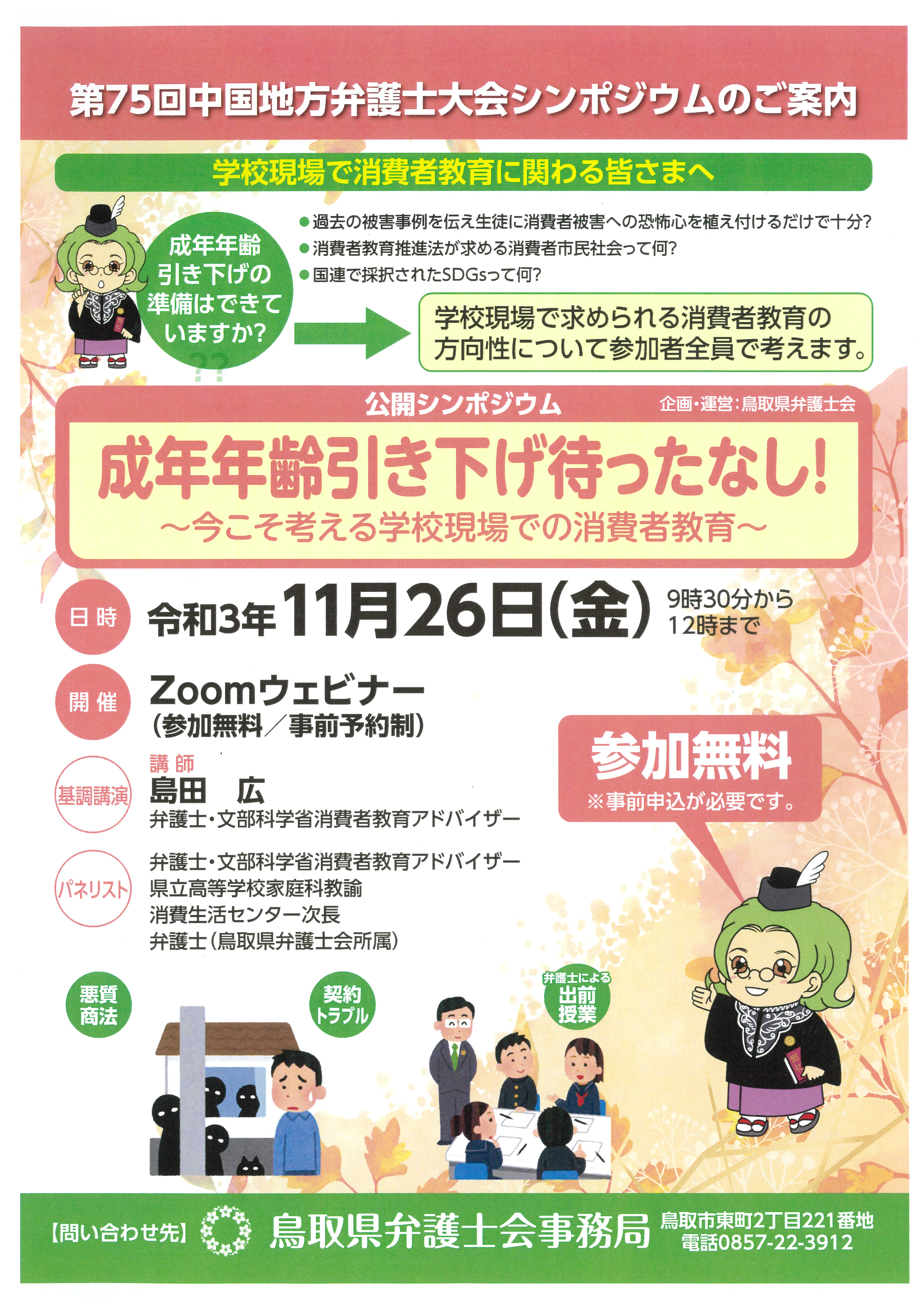 そこで,第75回中国地方弁護士大会の公開シンポジウムとして,「成年年齢引き下げ待ったなし!~今こそ考える学校現場での消費者教育~」と題して,シンポジウムを企画しました。